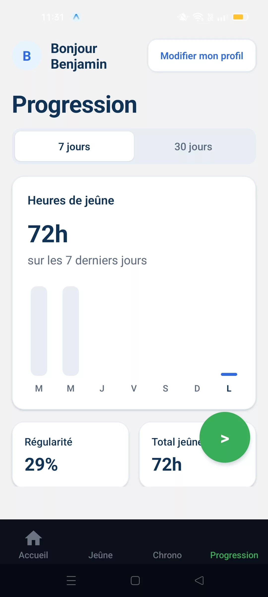 Une bonne application de jeûne intermittent doit te montrer tes efforts dans la durée, pas seulement ton cycle du jour. Bien Jeûner affiche :