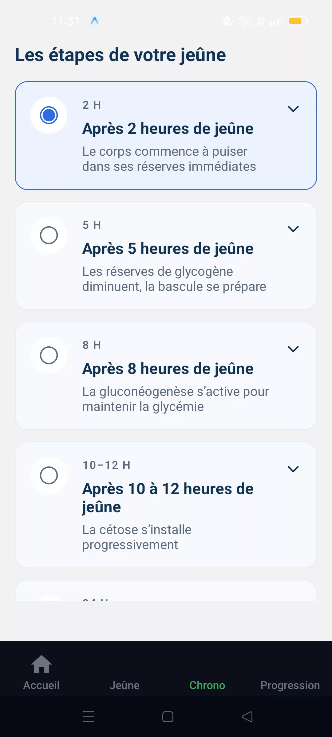 Beaucoup de gens tiennent mieux quand ils savent “pourquoi” ils le font. Dans l’application, tu retrouves une vue étapes du jeûne, pour suivre l’évolution au fil des heures avec des repères simples. Le but n’est pas de promettre des miracles : c’est de te donner un cadre compréhensible et motivant.
